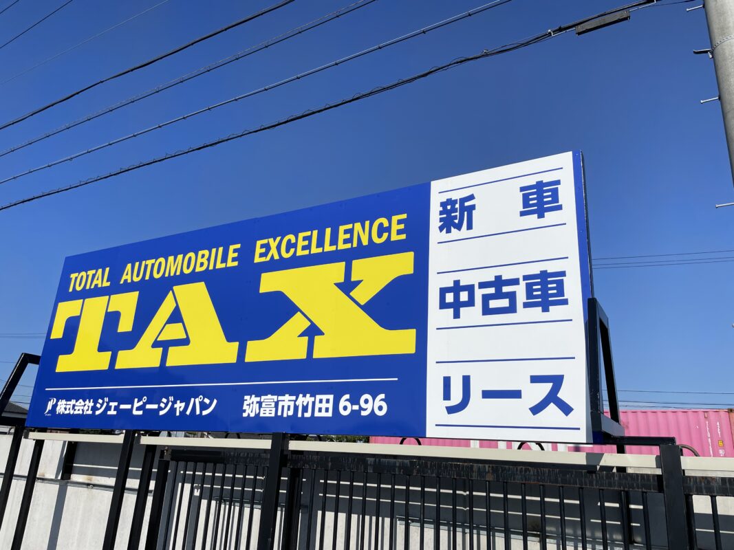 株式会社ジェーピージャパン様看板製作施工制作事例のご紹介 制作事例のご紹介 看板・サイン 2025年12月4日 株式会社ジェーピージャパン様看板製作施工 弥富市に新たに中古車・新車を扱うTAXがオープンいたしました。 国道に面する大きな看板、事務所のサインを製作させていただきました。遠くからでも見える大きいもので、デザインからさせていただきました。 新車と中古車、リース車がメインとなり全高展開しているTAXの弥富店になります。 ▶︎TAX弥富店様のサイトはこちら デザインに不安がある方もお任せください。弊社デザイナーがお客様のご要望をカタチにします。 ↓↓お問い合わせ・ご相談はこちら↓↓ TAX中古車弥富市看板自立看板車屋野建て 前の投稿に戻る 次の投稿へ進む 最近の投稿 入学式・卒業証書授与式の看板 ハラセサービス様看板施工 しば薬局様サイン施工 みつは受験教室様看板製作施工 ブライド・トゥー・ビー様サイン施工 アーカイブ 2026年2月 2026年1月 2025年12月 2025年11月 2025年10月 2025年9月 2025年8月 2025年7月 2025年1月 2024年12月 2024年11月 2024年10月 2024年9月 2024年8月 2024年7月 2024年6月 2024年4月 2024年3月 2024年2月 2024年1月 2023年12月 2023年10月 2023年9月 2023年8月 2023年7月 2023年6月 2023年5月 2023年3月 2022年12月 2022年6月 2022年2月 2021年10月 2021年9月 2021年8月 2021年7月 2021年6月 2021年5月 2020年5月 2020年4月 2020年2月 2019年12月 2019年11月 2019年8月 2019年7月 カテゴリー カーラッピング グッズ制作 その他 デザイン制作・印刷 印刷物 看板・サイン